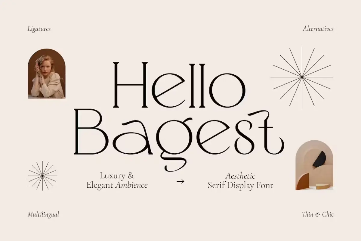 Discover Hello Bagest, an aesthetic serif display font equipped with alternatives and ligatures. Perfect for creating striking logos, quotes, invitations and more, it also provides comprehensive multilingual support.
