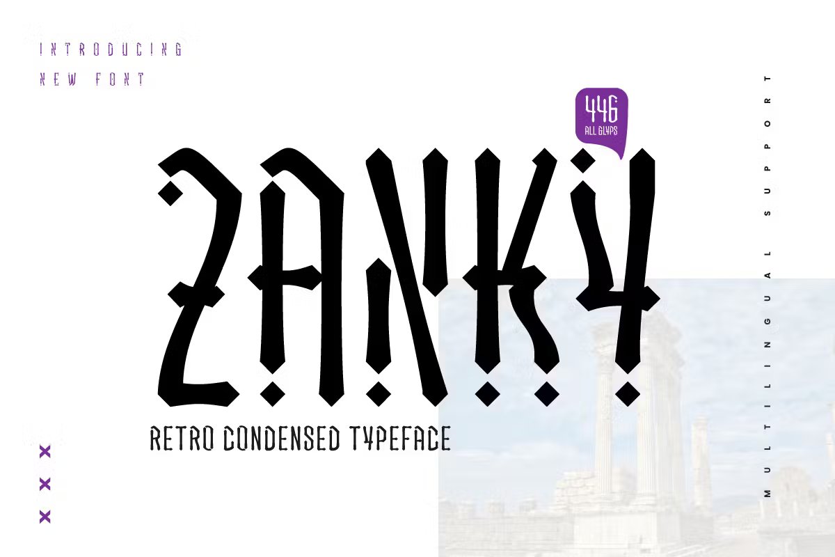 Zanky’s unique condensed shape ensures that it stands out in any design project, making it the perfect choice for anything from logos to posters. Additionally, its stylistic set alternate feature provides even more design flexibility, allowing you to create unique and eye-catching designs with ease.