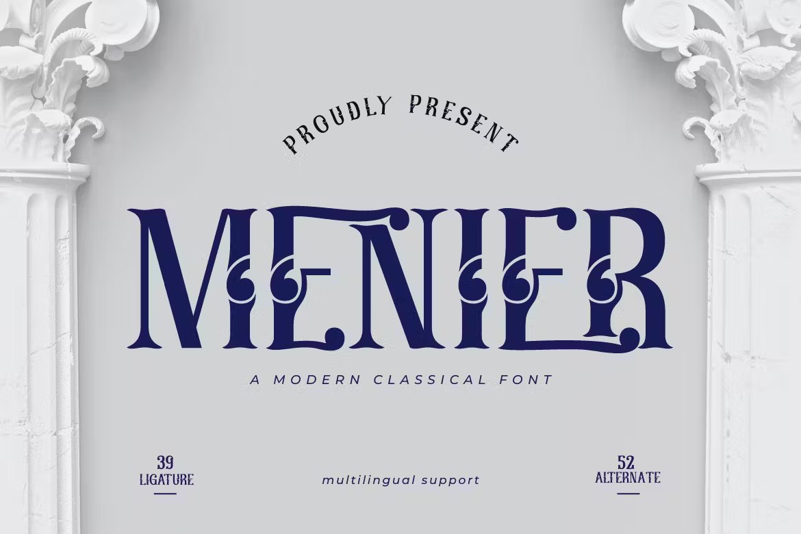 Introducing Menier, the perfect retro condensed font for any project! Its classic style and sleek design make it a versatile choice for both print and digital designs. With 52 alternate characters and 39 ligatures, Menier allows you to create unique and eye-catching designs with ease.
