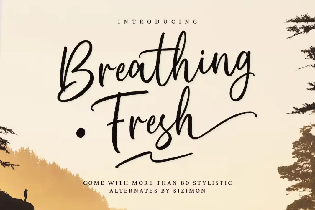 Breathing Fresh is a handwritten script font. This font is perfect for quotes, branding, ornaments, shirts, mugs, headings, blogs, logos, invitations and more!