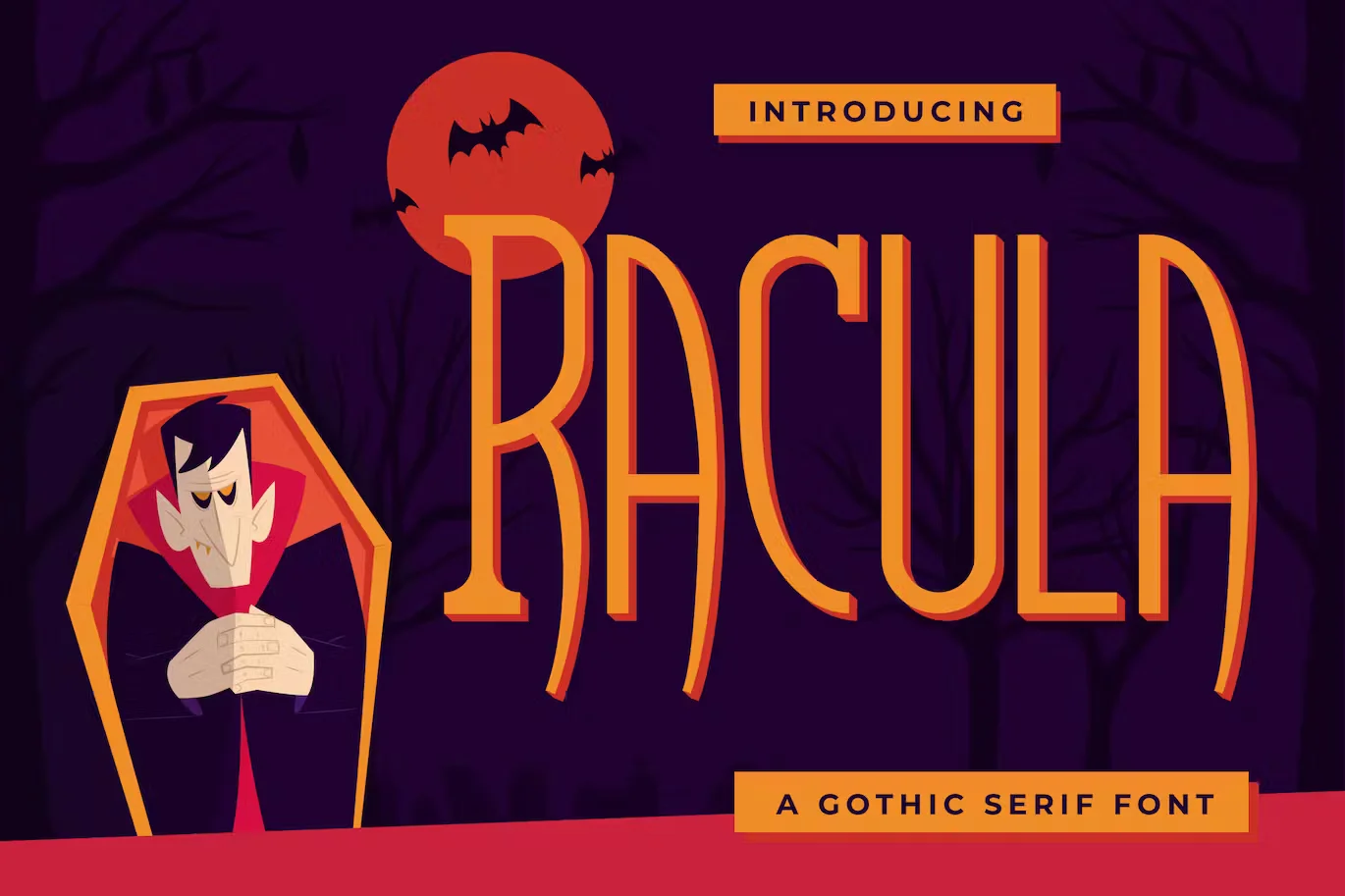 Racula is an fun, scary, and amazing gothic serif. It will add a unique and stunning look to your designs. It is perfect for fun scary games, children horror storybook, logos, branding, advertising, Halloween projects, gothic designs, tattoos, and more!