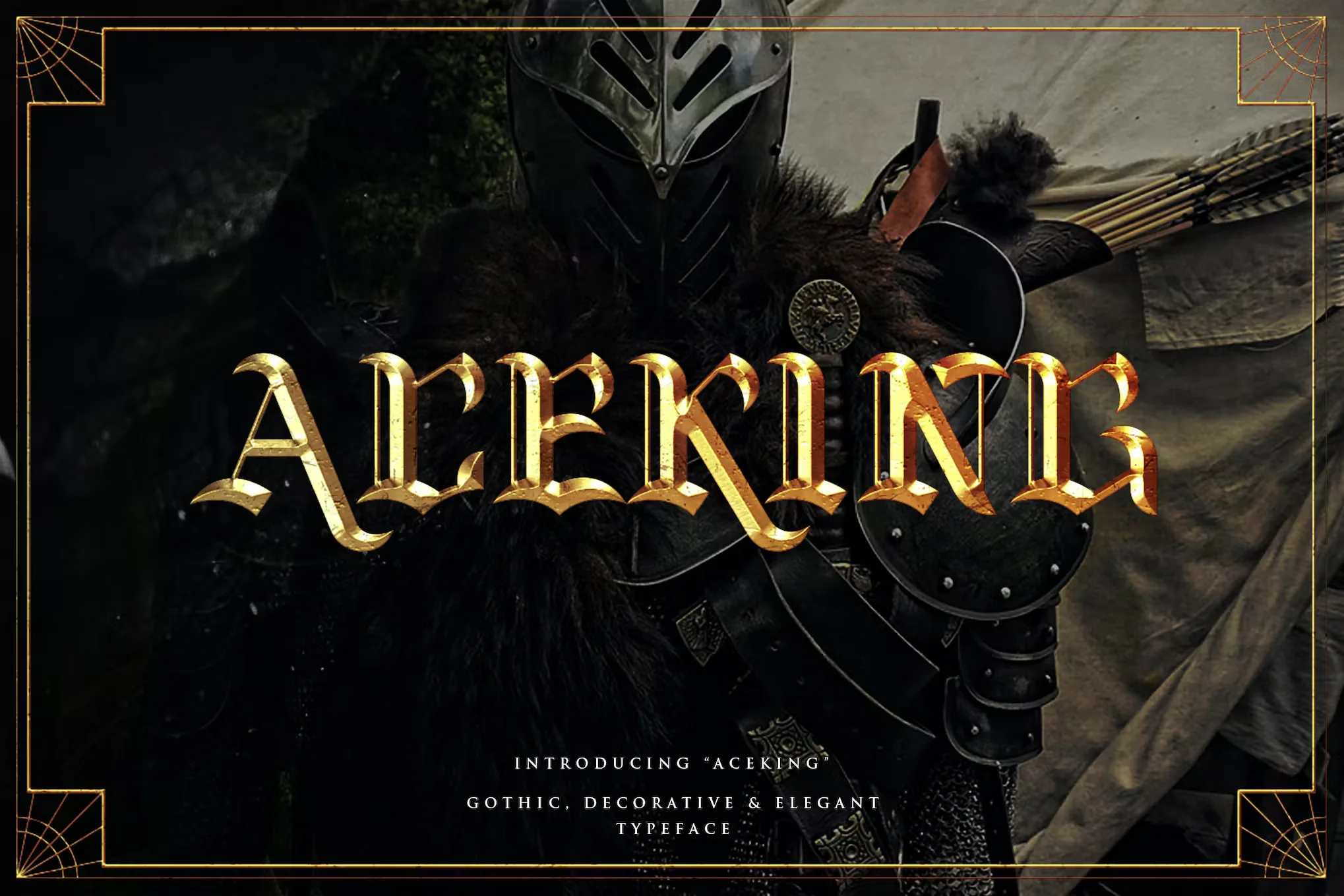 Looking for a vintage display font with a solid and bold medieval feel? Look no further than Aceking font! Try downloading Aceking font today. The font is versatile and can be used for any occasion, such as books, logos, prints, games, bands, events, music, invitations, and more.