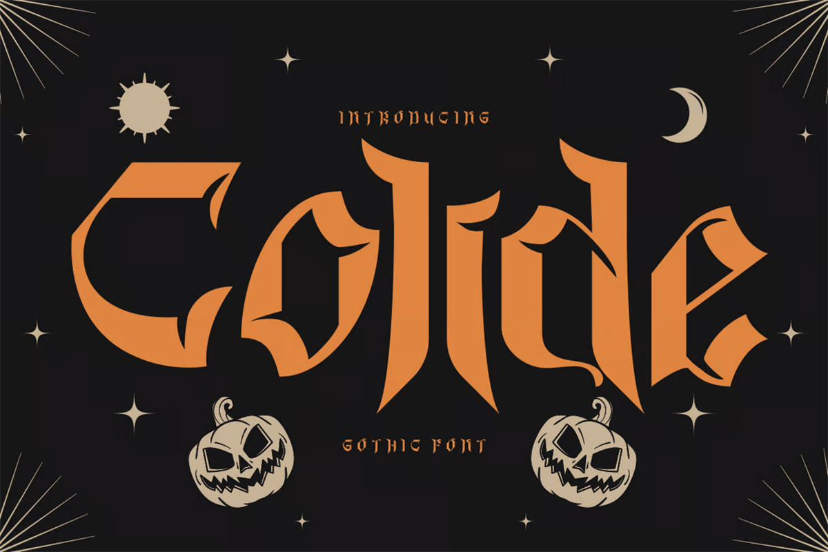 Colide presents a unique take on Gothic style, breaking away from conventional norms. This font features distinctive pointed tips and a cut line running through the body, setting it apart from typical Gothic fonts. Its edgy and unconventional design adds a touch of intrigue and horror to your projects.
