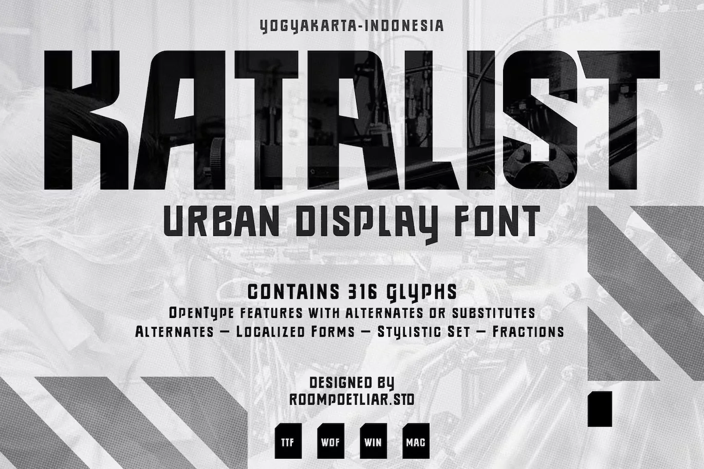 Katalist Urban Font Display. Strong-striking font with boxy and sharp feeling. Suits best for poster designs, headlines, typography projects (streetwear, construction, resistance, solidarity, movement, revolution), Religion event, E-Sport logos, sports jersey text, etc.