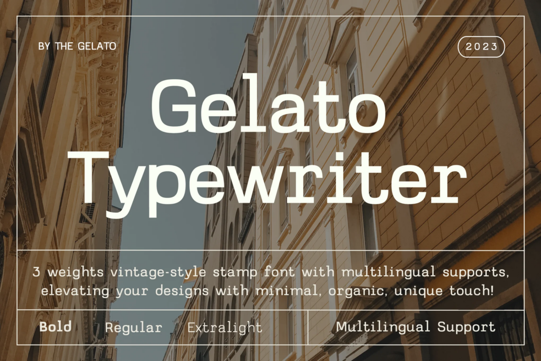 Gelato Typewriter is a vintage stamp font that comes in three different weights. It’s great for giving a simple, organic look to logos, business cards, or banners. It’s a flexible font that works well for many types of designs.