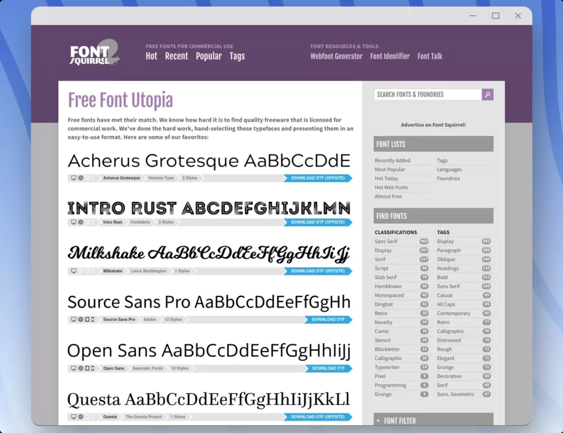 Font Squirrel is another excellent resource for free commercial use fonts. It offers a curated collection of high-quality fonts that you can use for both personal and commercial projects. The fonts are hand-picked and tested for quality, and you can filter them by style, license, popularity, and more. Font Squirrel also provides a webfont generator that allows you to convert the fonts into web-friendly formats.