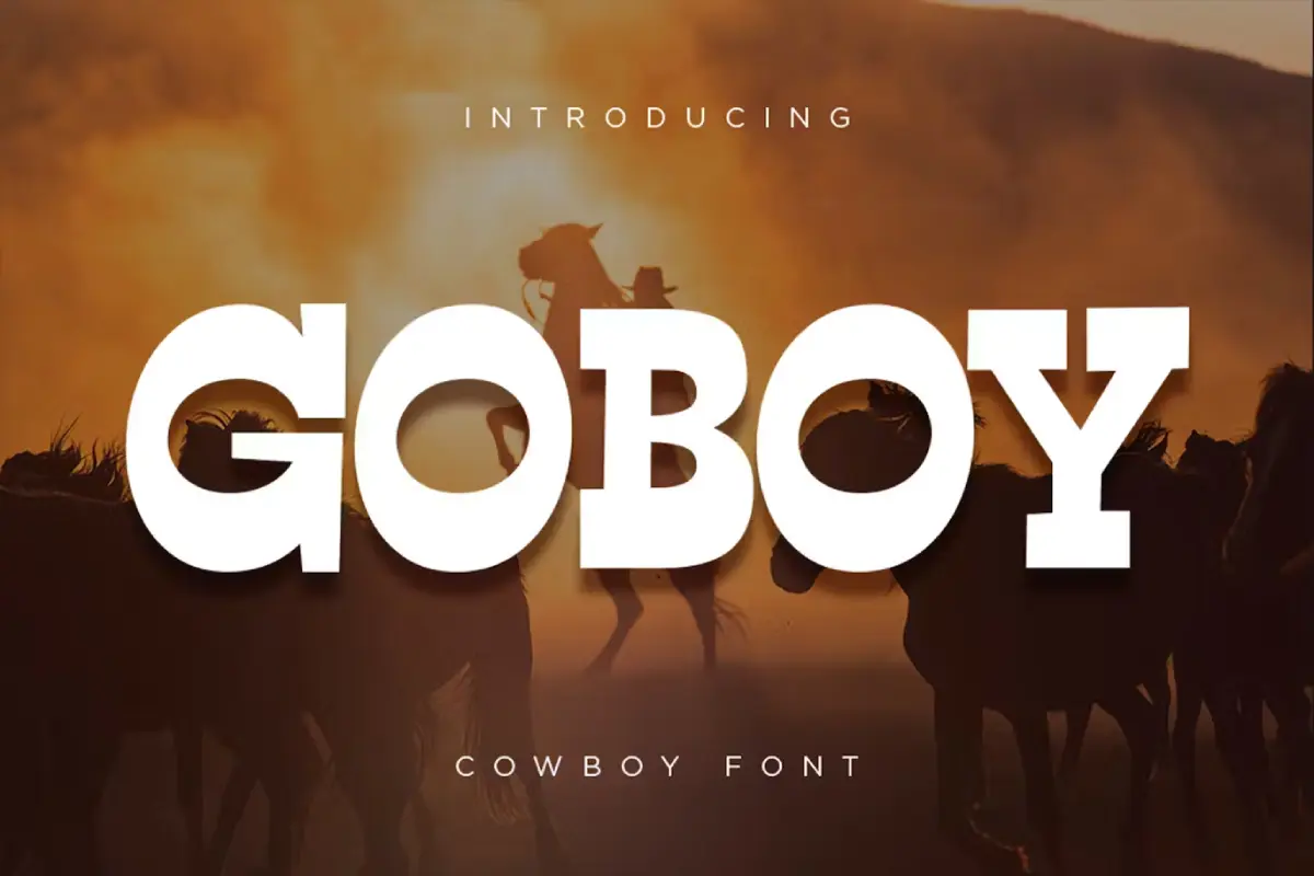 Go Boy is a slab serif font that brings to mind the cowboy and rodeo era. It has a playful, fun, and bouncy shape in each letter, making it a great choice for various design needs. Whether you’re working on a logo, brand identity, packaging design, or even set decoration, Go Boy can easily fit the bill. Its unique style can also bring a fun visual concept to your project. Simply put, if you’re looking for a font that captures the spirit of the Wild West while keeping things light-hearted, Go Boy is a fantastic option.