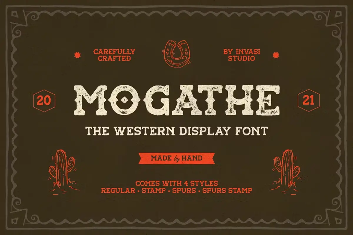 Introducing Mogathe, a font that takes inspiration from the West life era. With its vintage western appearance, Mogathe offers four styles: Regular, Stamp, Spurs, and Spurs Stamp. Use this font to create stylish designs that capture the nostalgic and authentic feel of the West life era.