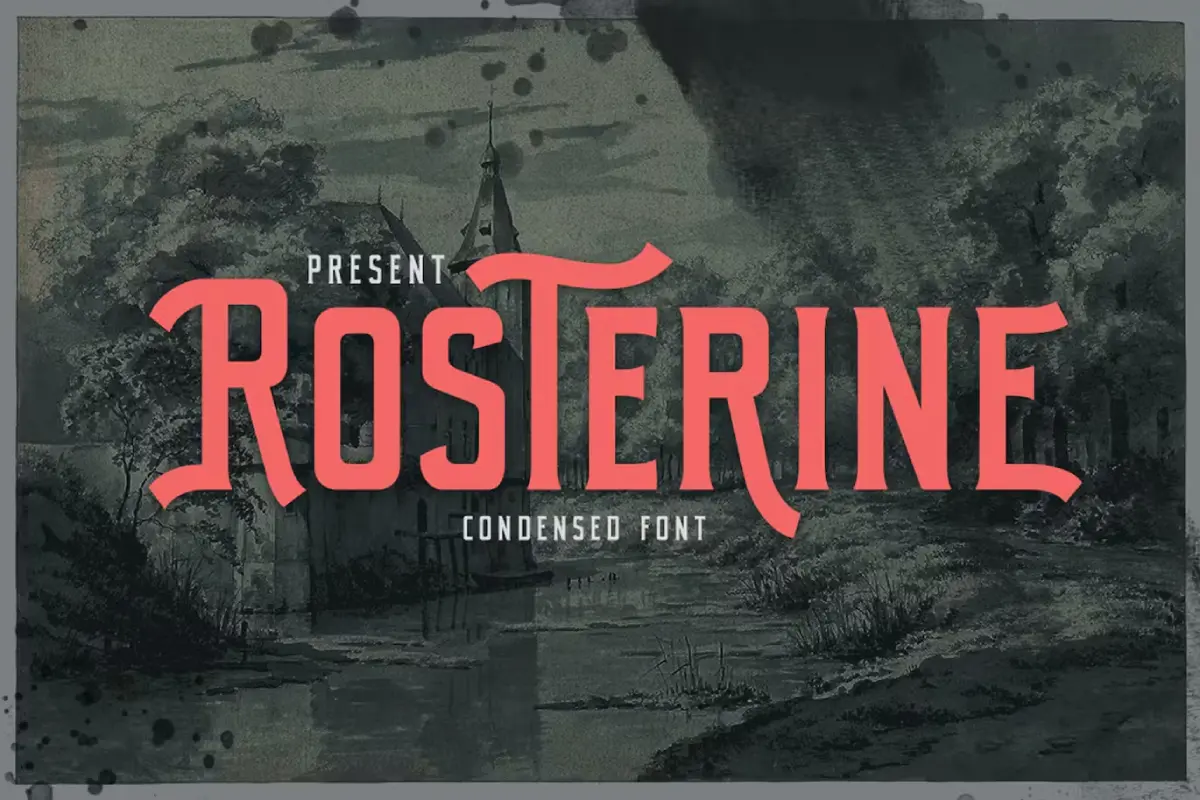 Introducing Rosterine, a condensed display font with a nostalgic and vintage touch. With its unique appearance and strong characters, it’s ideal for logos and various formal applications like invitations, labels, magazines, books, cards, packaging, fashion, stationery, novels, and advertising.