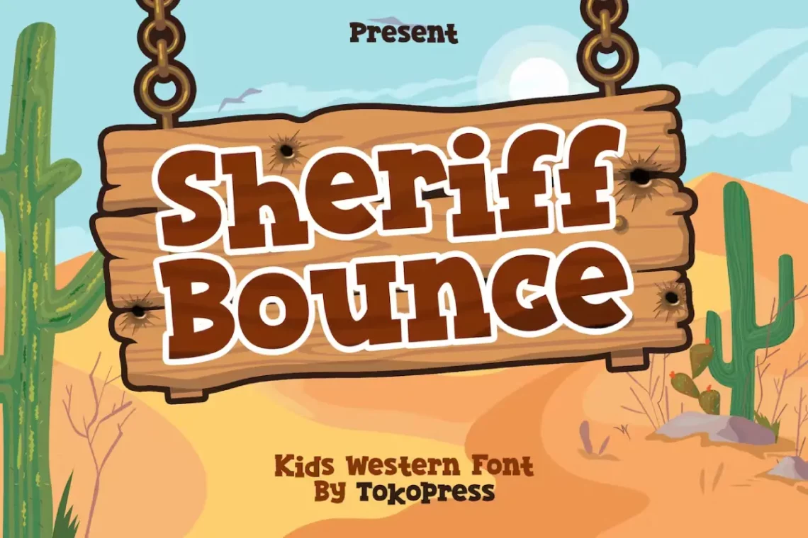 Introducing Sheriff Bounce, a playful kids western font that’s just as fun as it sounds. With its bouncy baseline, it embodies the lively spirit of the Wild West and will quickly become a favorite in the realm of children’s typography.
