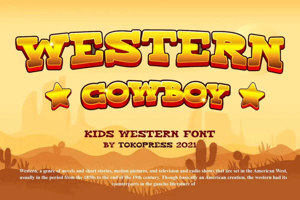 Introducing Western Cowboy, the delightful and energetic font that brings the spirit of the Wild West to your fingertips! With its bouncy baseline and Western charm, this font is designed especially for kids who love all things cowboy. It’s the perfect addition to your collection and is bound to become your new favorite font in town. So saddle up and get ready to embrace the wild frontier with Western Cowboy!