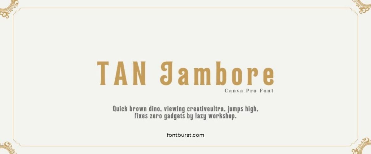 TAN Jambore is a one-of-a-kind decorative font with a vintage look and lots of small details. Its fancy design makes it stand out, and that makes it perfect for logos, packaging, and other projects that need to look classy and bring back memories. TAN Jambore gives your designs a quaint and classic look.