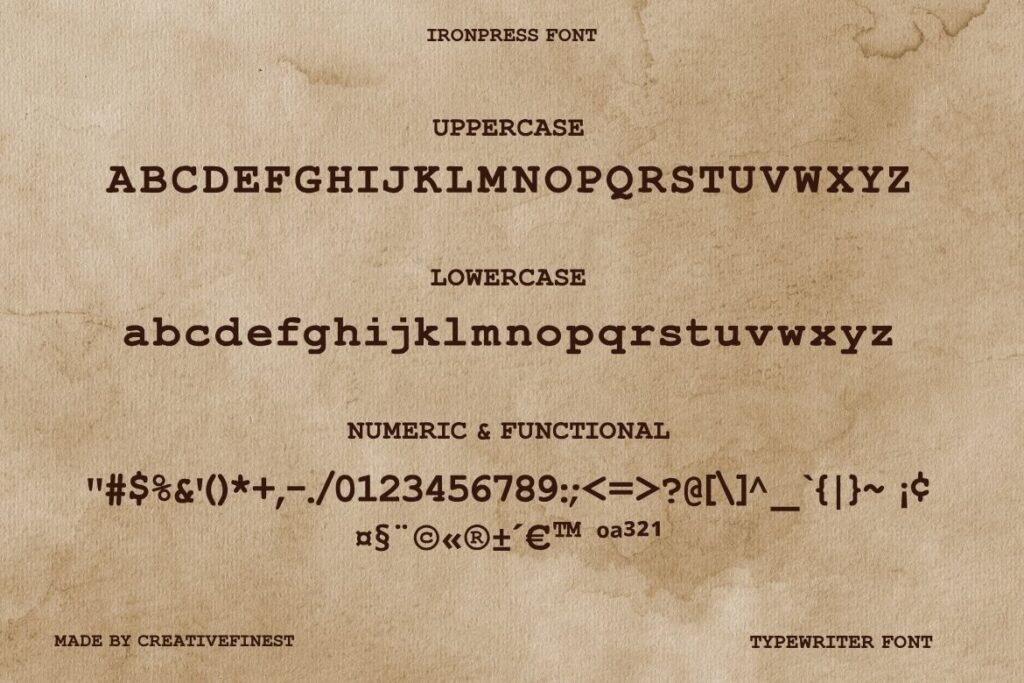 Step back into the analog era with Iron Press, a bold and distressed typewriter-style font made to bring texture, nostalgia, and personality to your projects. It blends that classic old-school typewriter look with just the right touch of modern usability — perfect when you’re aiming for something raw, real, and full of character.