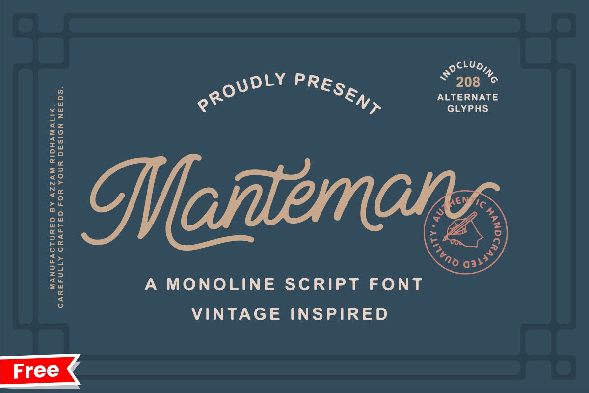 Manteman Monoline Script Font was inspired by vintage style typography combined with modern typography style. Manteman Font is great for logotype, branding design, logo design, digital lettering arts, t-shirt/apparel, poster, magazine, advertising design, and any vintage design needs.