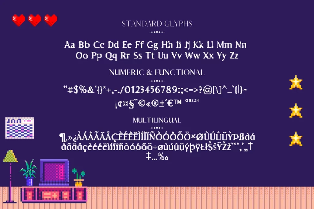 Introducing Thumbpix Pixel Font, a bold and bubbly 8-bit typeface designed to make your text stand out. This font is packed with everything you need to build striking titles, vibrant UIs, nostalgic posters, and more.