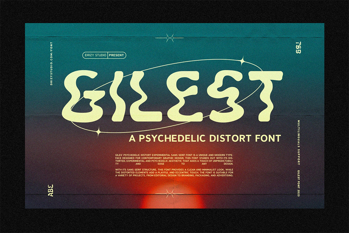 Gilest A Psychedelic Distort Font from Drizy Studio. Get lost in the trippy, mesmerizing world of Gilest: a psychedelic font that bends reality and challenges your perception of typography.