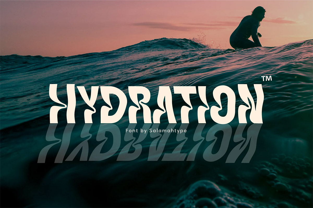 Hydration is a bold, wavy, and dynamic display typeface inspired by the fluidity and movement of water. Its unique letterforms feature rippling edges that convey a sense of motion and energy, making it perfect for projects with oceanic, modern, or adventurous themes.