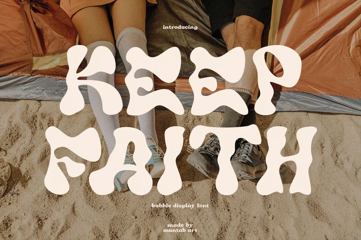 Keep Faith fonts include uppercase letters, lowercase letters, numerals, a large range of punctuation. Bubble font with retro style. Created for poster, web design, branding, illustrations, badges, and some other works.