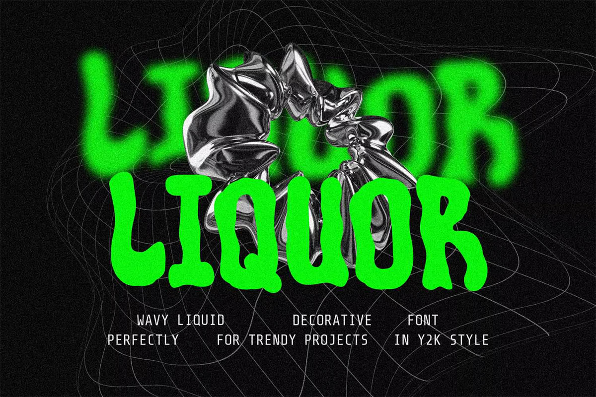 Liquor is a trippy wavy liquid decorative font and chunky with a lot of alternates and ligatures, which works perfectly for bold titles, festival posters, as a graphic element for bright T-shirt or hoodies, or even backgrounds!